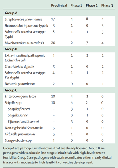 2017年,世界衛(wèi)生組織發(fā)布了一份“抗菌素耐藥性(AMR)重點(diǎn)細(xì)菌病原體”清單,以指導(dǎo)開(kāi)發(fā)新的有效藥物以對(duì)抗抗菌素耐藥性的研究重點(diǎn)。目前,只有三種針對(duì)優(yōu)先細(xì)菌病原體的獲得許可的疫苗,分別是:肺炎球菌結(jié)合疫苗 (PCV)、 b型流感嗜血桿菌(Hib)疫苗和傷寒結(jié)合疫苗 (TCV)。
